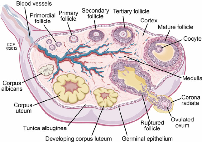 Ovulation in humans refers to the release of a mature egg (oocyte) from the ovary into the fallopian tube. It is a crucial event in the menstrual cycle and typically occurs around the midpoint of the cycle, approximately 14 days before the start of the next menstrual period. Ovulation is triggered by a surge in luteinizing hormone (LH) levels, which is primarily stimulated by high levels of estrogen. This surge causes the dominant ovarian follicle, which has been developing during the follicular phase, to rupture and release the mature egg.